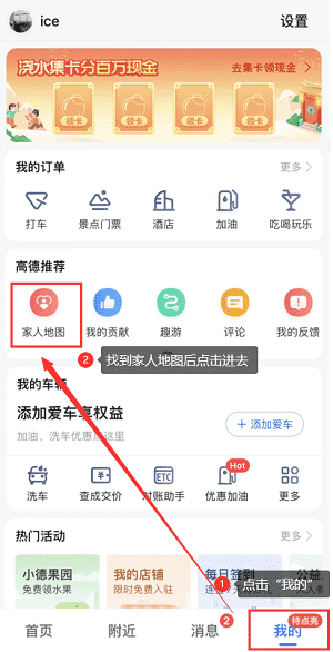 第一步:打开高德地图,在右下方点击”我的”,之后在“高德推荐”下面的栏目中往右边拨动找到【家人地图】,确认并点击进去。