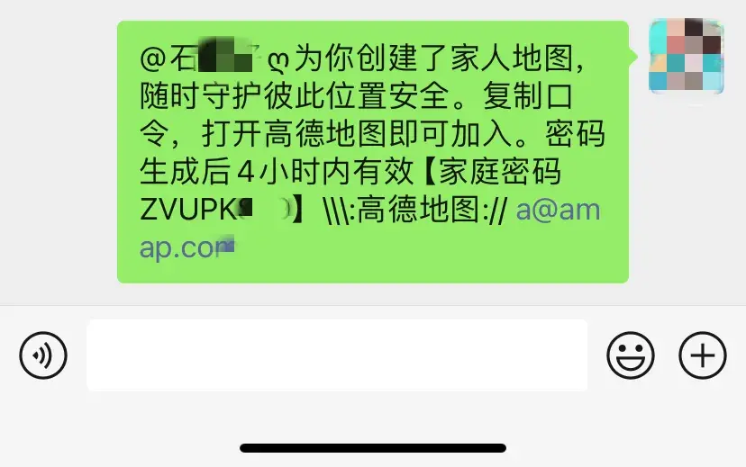 分享后选择特定的家人,在输入框粘贴以下信息,只要对方点击链接进入,你们就绑定成功了。