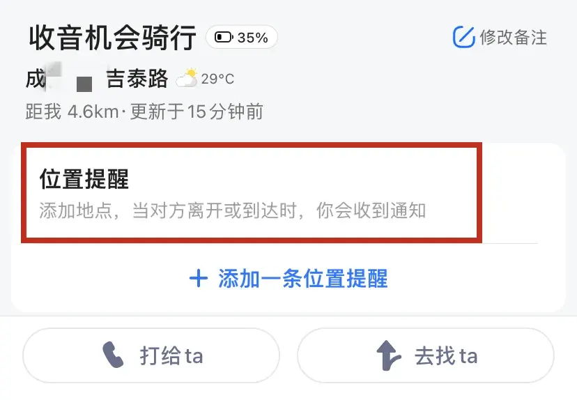 此外,家人地图还能设置位置提醒,你添加一个地点,当对方离开或到达这个地点时,就会收到通知。