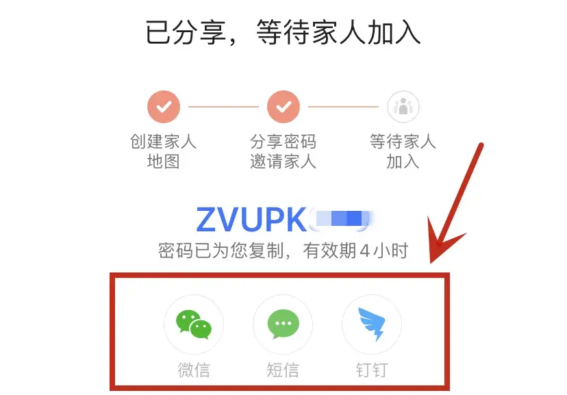 这里系统会自动生成家庭密码,只需将这个密码分享给特定的家人,你们就绑定成了家人关系。分享形式有以下3种,任选其一点击即可。